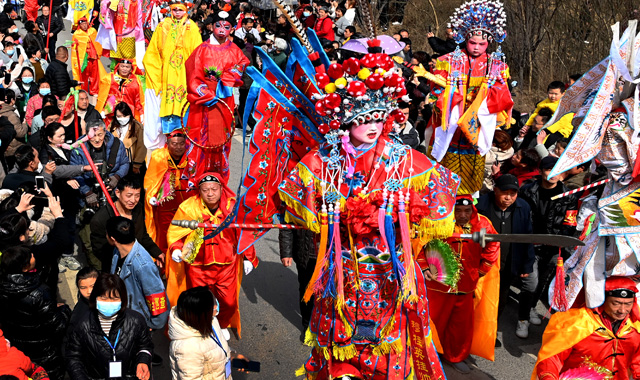 当日是农历正月二十九,陕西省西安市临潼区栎阳街道卷子村举行“背芯子”表演,吸引了许多群众前来观看。