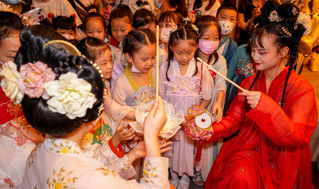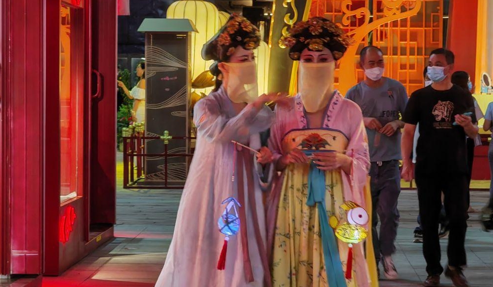 中秋小长假,位于西安市曲江新区的长安十二时辰主题街区游人如织,街区特别打造“皓月家阖 忆长安”等特色活动,让大家沉浸式体验唐朝人的中秋节。