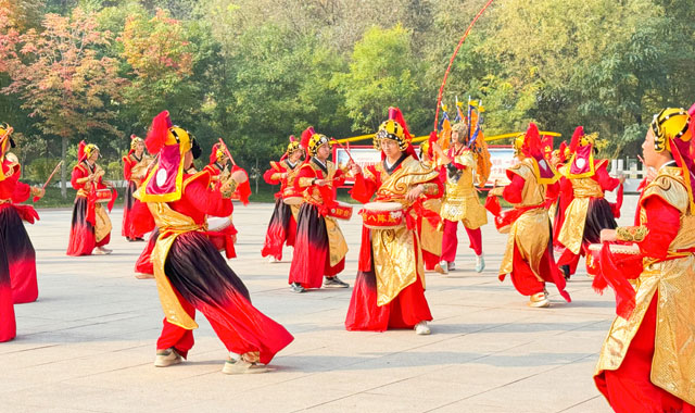 时而前进、时而穿插、时而列阵……10月15日,来自铜川市第五中学的数十名学生身着仿古战服,正认真练习铜川市非物质文化遗产项目——印台八阵鼓。