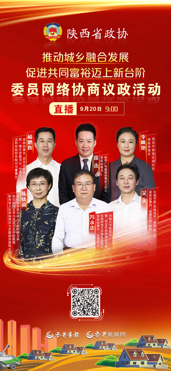 按照陕西省政协办公厅《关于在全省政协系统举办2024年“委员活动日”的通知》要求,9月20日上午9:00,围绕“推动城乡融合发展,促进共同富裕迈上新台阶”主题,邀请5名省政协委员、专家学者就我省推动城乡融合发展,促进共同富裕迈上新台阶开展网络协商议政活动。