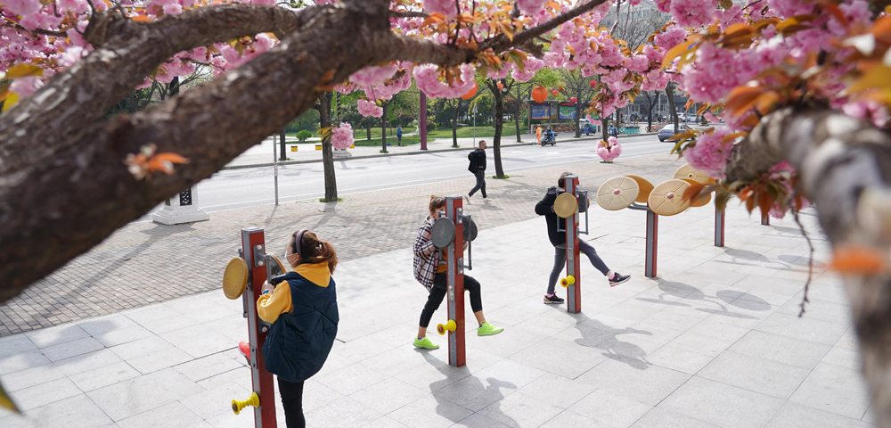 3月31日,市民在西安曲江新区一处广场上锻炼。 近日,陕西西安曲江新区一些广场和街道樱花盛开,成为市民健身休闲的好去处。……