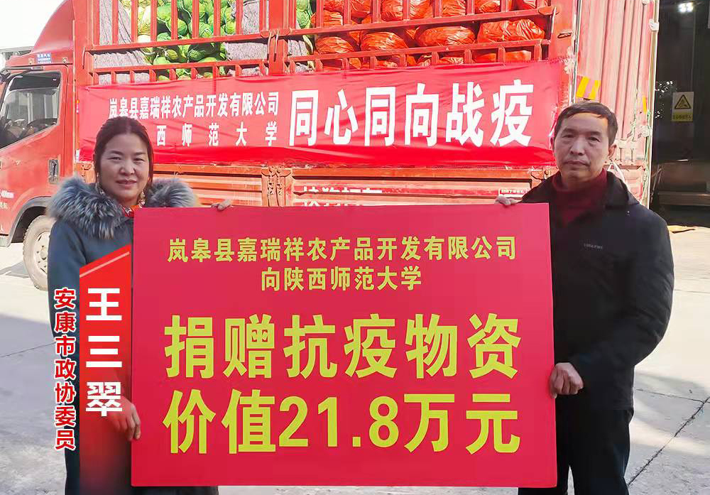 疫情期间,安康市政协委员王三翠在得知陕西高校缺少生活物资后,积极联系政府对接物资捐赠事宜,先后捐赠价值31.88万元的物资用于支援陕西师范大学、陕西科技大学。